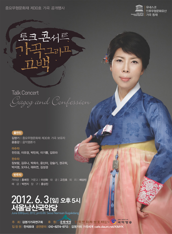 'TALK CONCERT 가곡, 그리고 고백'은 조선초기부터 전해오는 신비로운 음색의 여창가곡을 맛깔나는 토크와 함께 들어보는 김영기가곡연구회의 새 공연이다.