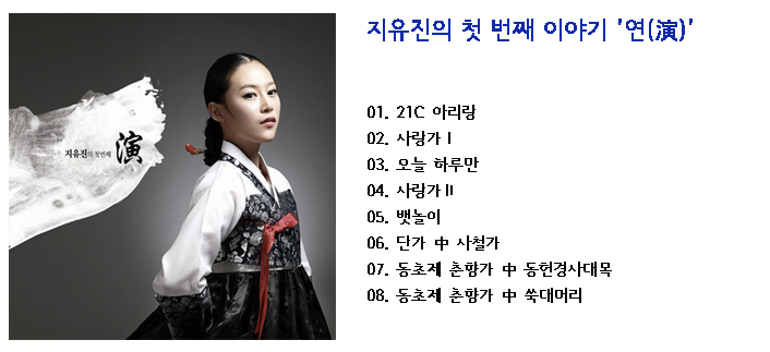 첫 번째 음반을 내 놓은 지유진은 동초제판소리 전공자로 ‘판소리’는 물론 전통적 요소를 소재로 삼아 대중적으로 풀어놓은 ‘21C아리랑’, ‘사랑가Ⅰ’ 그리고 대중의 기호에 맞춰 새로 작곡된 ‘오늘 하루만’, ‘사랑가Ⅱ‘, ’뱃놀이‘ 등을 통해 다양한 시도를 하고자 하였다.