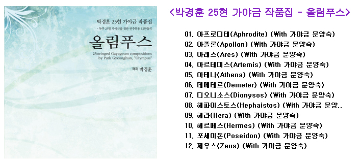 ‘올림푸스(Olympus)’라는 제목은 이 곡이 12개의 곡으로 이루어져 있어서 그리스 올림푸스의 12신에 상징적으로 가리키는 말로 붙여졌다. 본래 연습곡집이지만, 연주회의 무대에서도 연주할 수 있는 음악적 내용을 지니고 있어, 독주 25현 가야금의 연주레퍼토리로도 활용이 가능하기에 ‘연주회용 연습곡’이 된다.