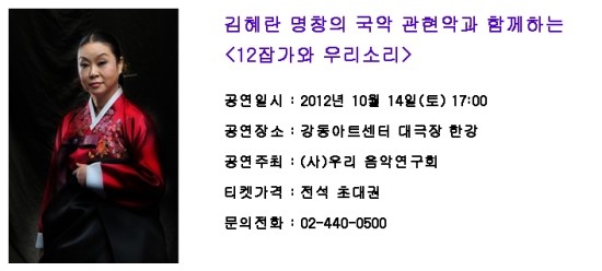 공연제목 : 김혜란 명창의 국악 관현악과 함께하는 <12잡가와 우리소리>