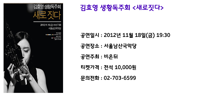 이번 공연 ‘새로 짓다’에서는 보다 새로운 시도로 생황의 다양한 면을 소개 한다. 컴퓨터 음향과의 조우, 다양한 연주법을 활용한 즉흥연주, 작곡가 황호준, 박경훈의 생황을 위한 창작곡 그리고 김효영이 생황을 위한 산조를 직접 구성하여 선보일 예정이며, 이 연주를 통해 김효영은 생황 연주자로써 한걸음 더 새롭게 도약하고자 한다.