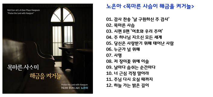 Precious talents have been given to me. I, who was ignorant of God, and I remember, with celebration, God first approaching me . I confess that I am not now in such a position as to return glory to God with all my heart in the midst of the bursting & overflowing thanks that I am enjoying every moment of God's grace and peace. Then to me, the Lord gave a larger mission, and this album is an offering to God. This album represents my praise and contemplation. I put down everything throughout the recording, with techniques and representation eliminated and my praise and devotion towards the Lord was fully packed inside the Haegeum's tone. As playing the Haegeum is the mirror of the mind of the performer, so my soft heart before the Lord was put fully into playing the Haegeum. I am always a thirsty deer, and a young lamb before the Lord rather than a Haegeum player. All this is hidden, and the Lord always strengthens me, which creates a new thing in my life every day. I hope my talents, endowed by God, or playing this Haegeum may be widely used for such missions planned by the Lord as glorifying the Lord, overseas missionary activities, etc.. I hope the purity of the intentions of my heart may reach the Lord through playing the Haegeum. As well I want my performance to touch any other mind and then hope that moment can help them know the Lord. Thank you, all!