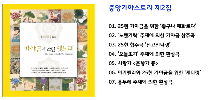 이 음반은 제 2회 중앙가야스트라 정기연주회 ‘가야금에 스민 옛노래’ (2009.10.28) 에서 연주된 곡들로 노래와 함께하는 민요곡을 현대와 전통이 공존하게 구성하였다.