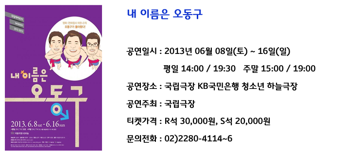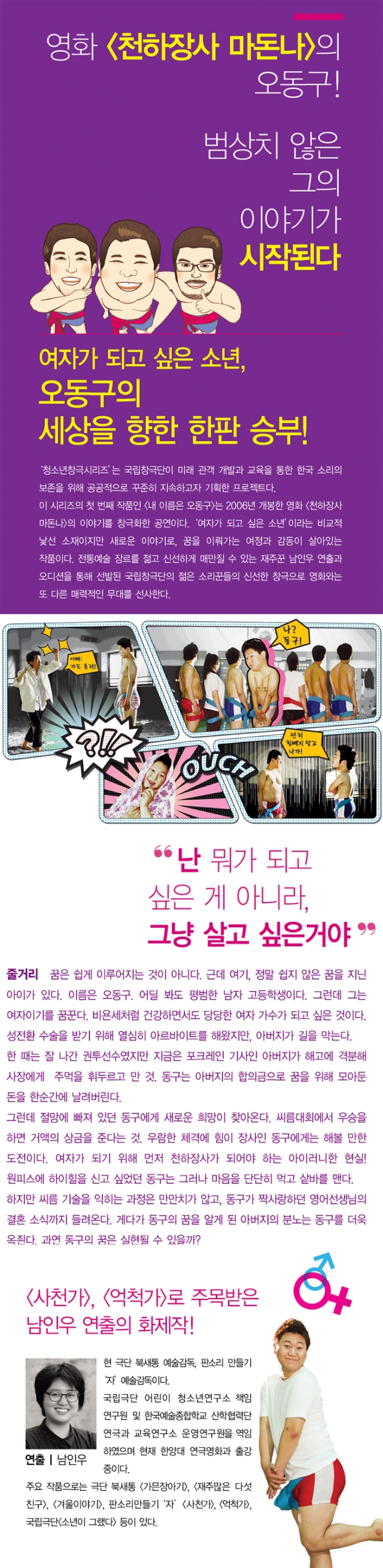 국립창극단이 청소년 창극시리즈의 첫 작품으로 선택한 것은 2006년 개봉한 영화 <천하장사 마돈나>의 이야기를 창극화한 <내 이름은 오동구>. ‘여자가 되고 싶은 소년’ 라는 비교적 낯선 소재이지만 새로운 이야기로, 꿈을 이뤄가는 여정과 감동이 살아있는 작품이다.