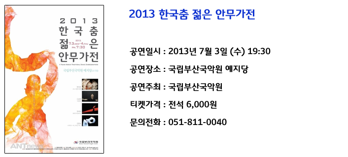 한국의 전통춤을 중심으로 그 춤에 숨어있는 이미지들을 찾아가는 실험 무대를 통해 전통의 다양한 면모와 창작 정신에 대한 이해를 높이는 2013 한국춤 젊은 안무가전!
