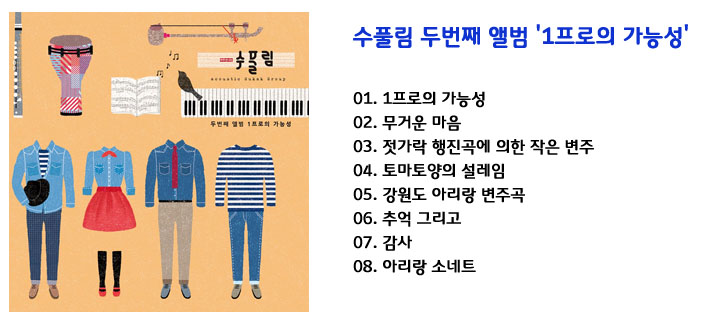 수풀림의 두 번째 앨범 ‘1프로의 가능성’은 국악의 흥미를 유발하기 위한 대중성이라는 친근한 국악을 추구함과 동시에, 연주하는 사람 스스로가 연주를 즐길 수 있도록 제작된 앨범이다. 수풀림의 클래식함과 어쿠스틱한 매력을 극대화시켜 진행된 제2회 정기연주회에서 처음 선보인 곡들을 모아 만든 음반이다. 수풀림의 첫번째 앨범과는 또 다른 매력으로, 혹 처음 듣는 분들이라도 충분히 감성적이고, 편안히 듣기에 좋고 모두가 함께 즐기기에 충분한 재미와 흥미로움을 느낄 수 있을 것이다.