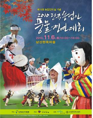 ‘2010전국농업인 풍물경연대회’가 11월6일 토요일 오전 10시부터 오후 4시까지 서울의 상징적 전통문화공간인 남산골 한옥마을에서 젊은명창 ‘남상일’의 사회로 펼쳐진다. 농업인의 날을 기념하고 농업인들의 화합을 위해 2007년부터 시작된 ‘전국농업인 풍물경연대회’는 전문연주자들의 경연이 아닌, 농업인들이 손수 펼쳐 보이는 국내 유일의 순수 생활국악 경연대회다. 풍물은 농업인들의 삶속에서 대대손손 함께 해 온 우리의 전통놀이로써 우리 민족 고유의 대동정신을 고취시키고 , 농업인으로서의 자긍심을 느끼게 해주는 우리민족고유의 전통문화다