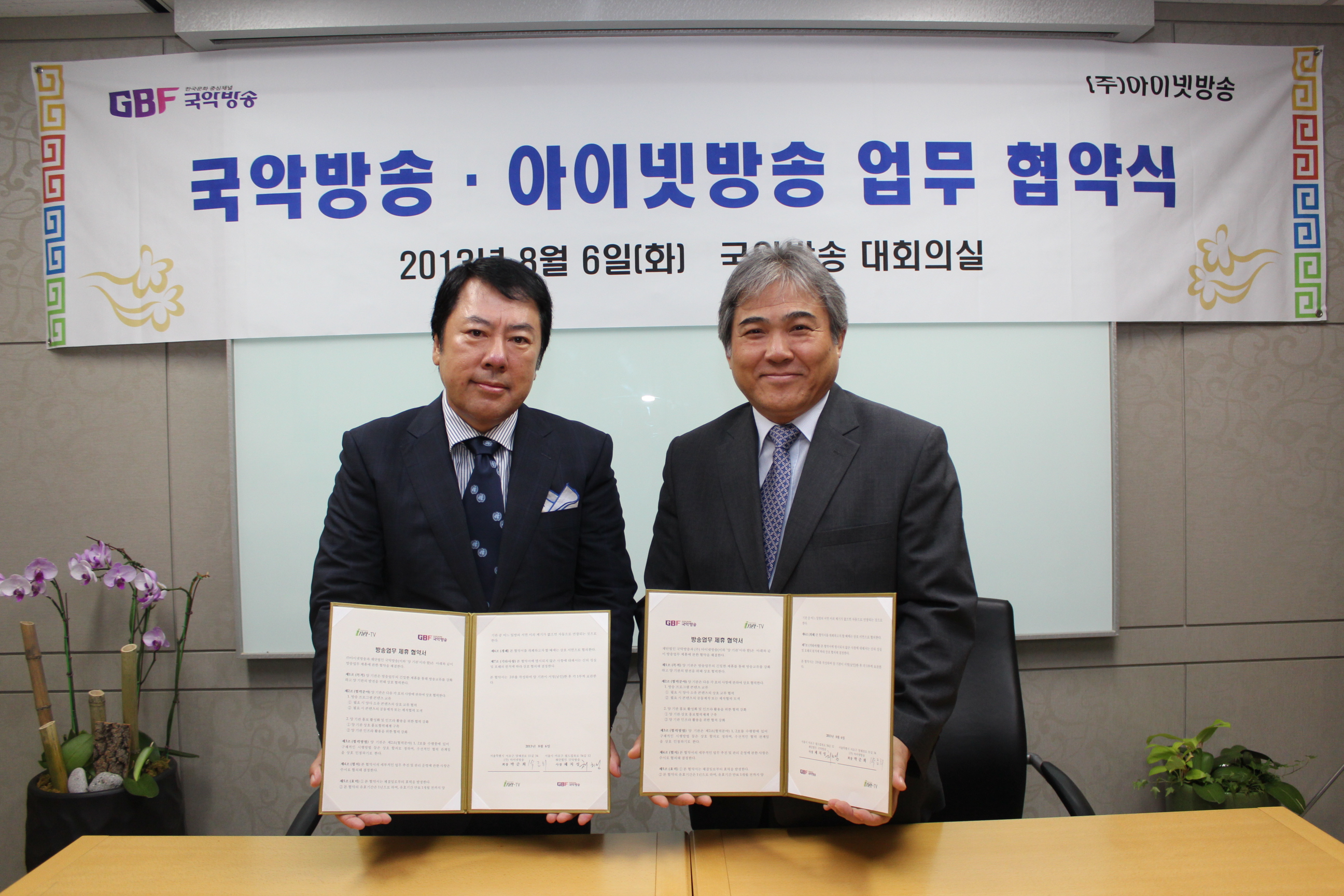국악방송 대회의실에서 열린 이번 업무협약은 GBF국악방송 채치성 사장과 김광호 문화영상콘텐츠부장, 정민 문화산업전문위원, 이윤경 경영기획부장, ㈜아이넷방송 박준희 회장, 이승렬 상무, 아이넷프로덕션 전용선 사장 등이 참석한 가운데, 방송프로그램 콘텐츠의 상호 교류 및 공동제작을 주요 골자로 하여 진행되었다.
