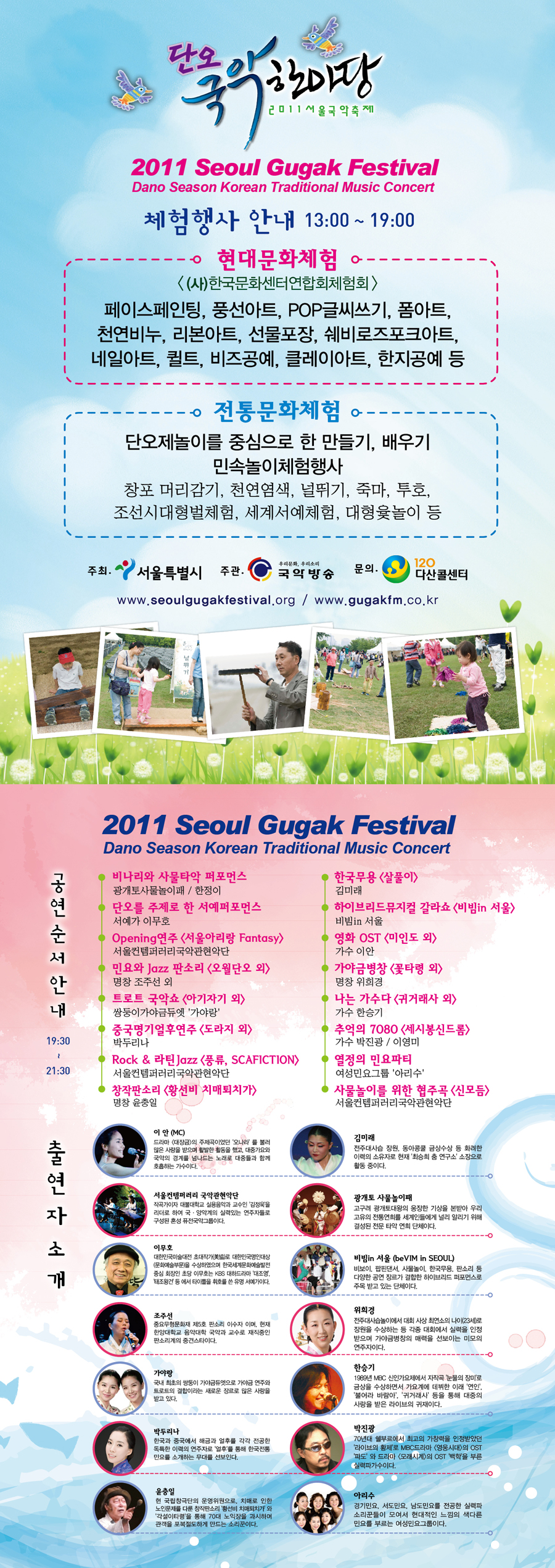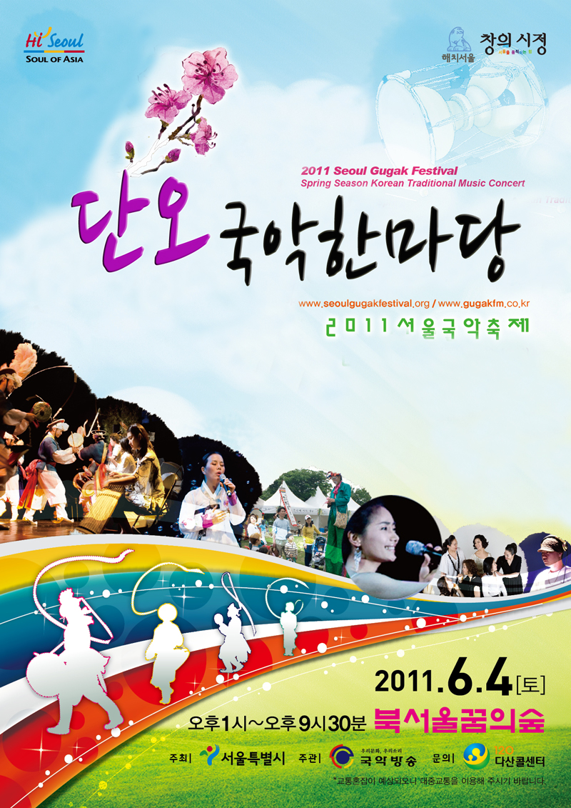 서울시가 주최하고, 국악방송이 주관하는 <2011 서울국악페스티벌 ‘단오 국악한마당’>이 6월 4일(토) 오후1시부터 9시30분까지 강북구 번동 <북서울 꿈의숲 잔디광장>에서 열립니다.