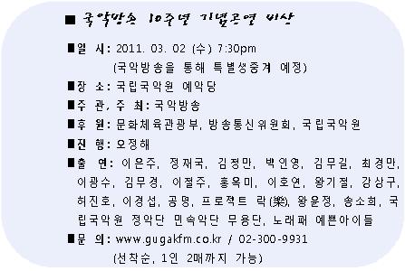 봄날의 설레임처럼 국악방송 개국 10주년을 맞는 3월 2일, 국립국악원 예악당을 찾는 모든 관객에게 특별한 공간, 소중한 순간이 될 것이라 기대한다.
