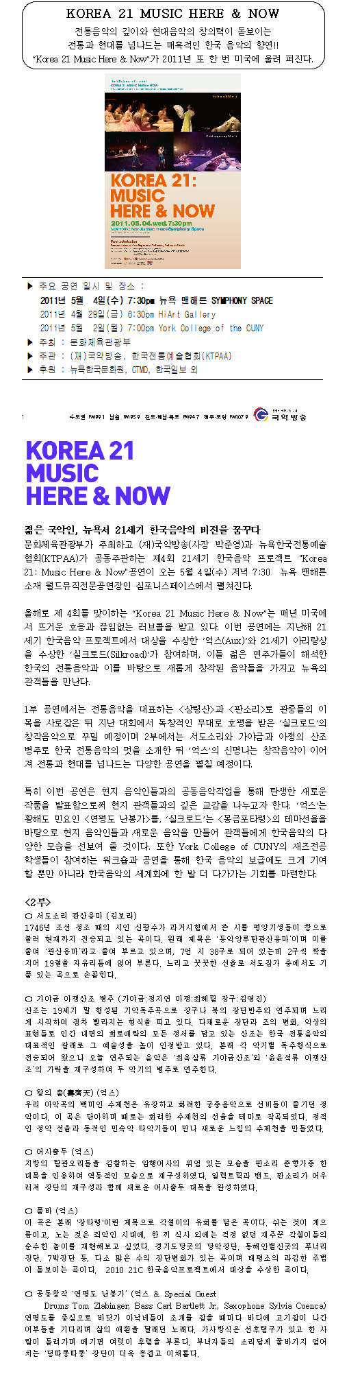 재단법인 국악방송 이(가) 창작한 21C_한국음악_프로젝트(미국공연) 저작물은 "공공누리" 출처표시 조건에 따라 이용 할 수 있습니다.