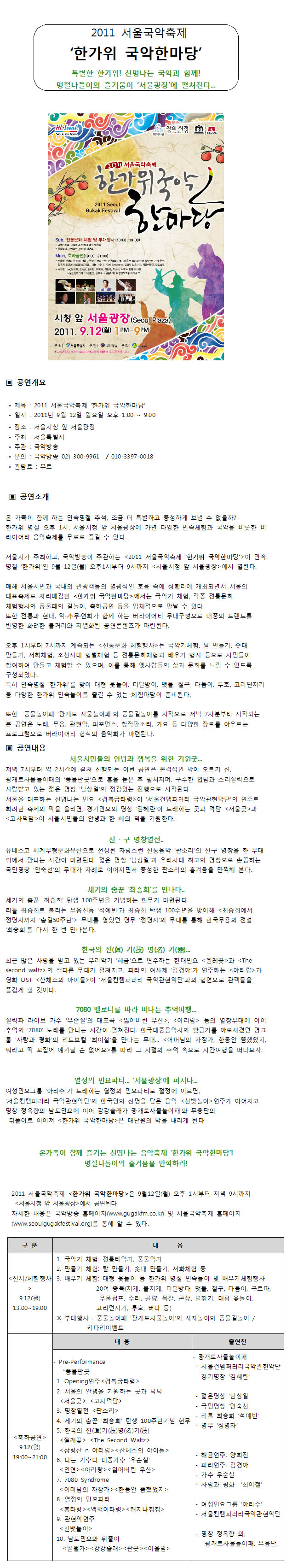 재단법인 국악방송 이(가) 창작한 2011 서울국악축제 한가위 국악한마당 저작물은 "공공누리" 출처표시 조건에 따라 이용 할 수 있습니다.