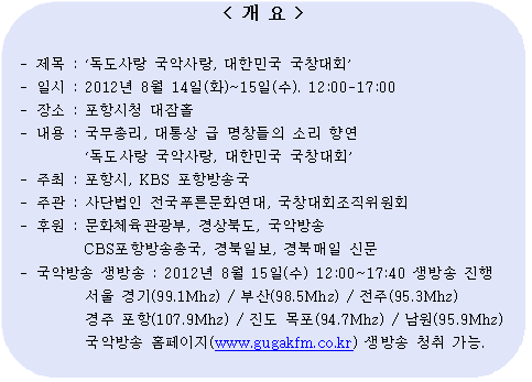 8월 15일 광복절을 맞아 포항에서 이틀간 ‘독도사랑 국악사랑, 대한민국 국창대회’가 열린다. 대회의 명칭에서 보듯 이번 대회는 <독도상> <동도상> <서도상> 등 대회수상명이 독도와 관련되어있다. 이번 경연은 대한민국의 땅 독도에 대한 마음을 돌아보고, 대한민국을 대표하는 명창들의 소리로 독도에 대한 관심을 높이고, 나아가 우리문화에 대한 애정을 드높이는 데 그 의미가 있다.