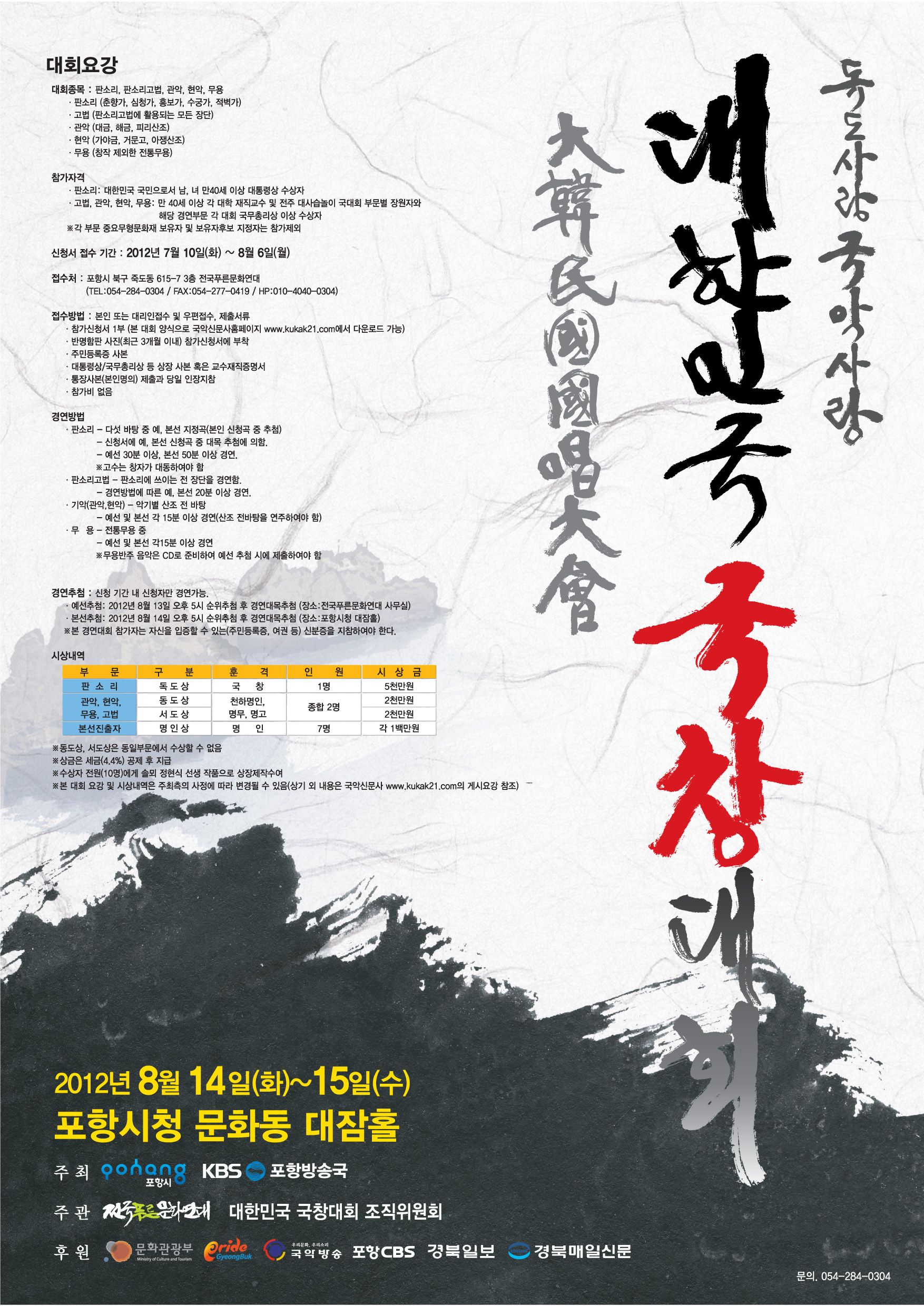 또한 이번 대회는 각 대회의 대통령상을 비롯해 국무총리상 이상을 수상한 40대 이상의 명인, 명창이 참여하는 수준 높은 경연대회로 진정한 국창을 뽑는 대회가 될 것이다. 판소리 뿐 아니라 ‘관악, 현악, 무용, 고수’ 분야의 명인 명창들이 참여할 예정이며 14일(화) 예선경연을 거쳐 15일(수) 포항 시청 대잠홀에서 본선 경연이 치러진다. 본 대회 최고상의 수상자는 상금뿐 아니라 독도에서 공연할 기회도 갖게 된다.