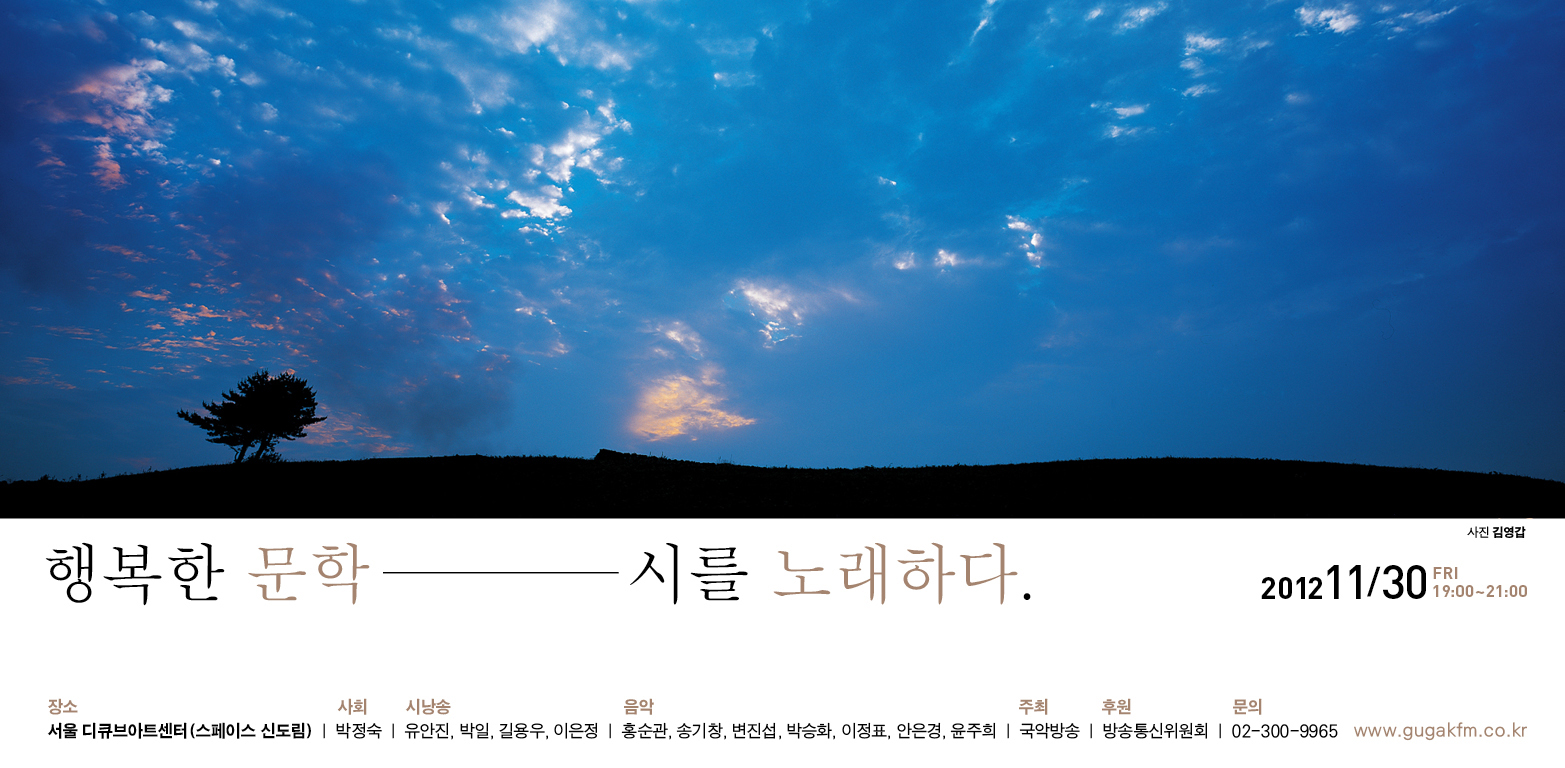 국내 최초 라디오 문학 프로그램인 국악방송의 <행복한 문학(99.1khz: 매주 평일 pm10시-12시 방송)>이 방송 4주년을 맞이하여 특집 공개방송“행복한 문학, 시를 노래하다”를 개최한다.