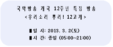 국악방송(서울경기 FM99.1, 부산 FM98.5, 대구 FM107.5, 전주 FM95.3 경주포항 FM107.9, 강릉 FM 103.3, 진도, 목포 FM94.7, FM남원 95.9 MHz)이 2013년 3월2일 개국 12주년을 맞아 특집 방송을 한다.