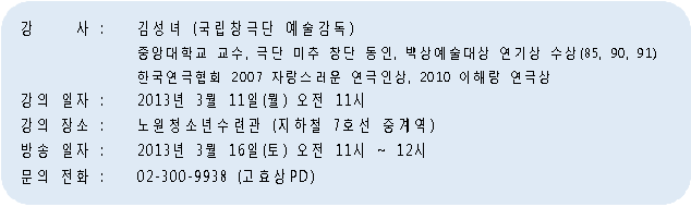 이번 강의는 국악방송 특강의 100회 특집으로 일반인들에게도 널리 알려진 연극인이자 국악인인 김성녀 국립 창극단 예술감독이 강사로 나선다.