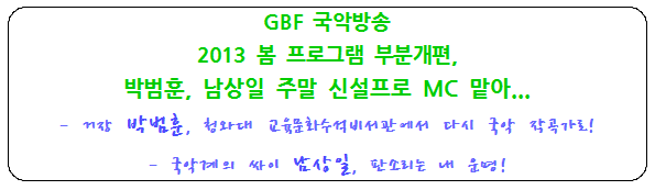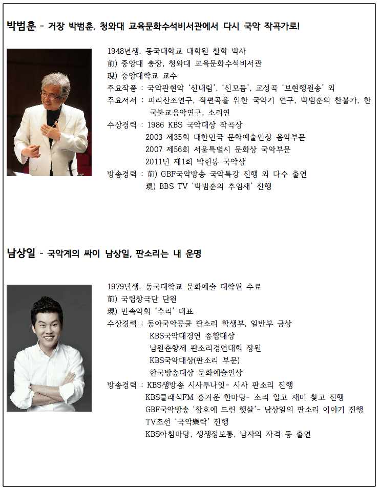 한국문화 중심채널 GBF 국악방송(방송본부장 박경규)이 봄 개편을 맞아 새롭게 마련한 주말 프로그램 ‘박범훈의 소리연’과 ‘남상일의 소리소문’을 신설했다.