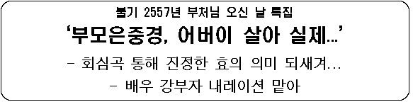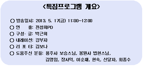 2013년 5월 17일(금, 11:00~12:00) 방송될 불기 2557년 부처님 오신 날 특집 <부모은중경, 어버이 살아 실제...>는 배우 강부자의 내레이션으로 함께한다.