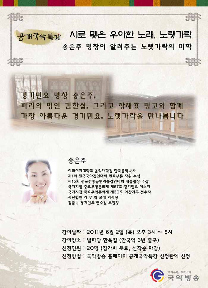 [공개국악특강]송은주 명창이 알려주는 노랫가락의 미학 방청 신청 안내