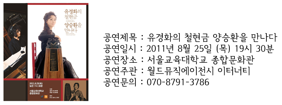 2010 KBS 국악대상 현악부문을 수상한 이 시대를 대표하는 중견연주가 유경화의 독주회 시리즈로 진행되는 [유경화의 철현금 양승환을 만나다]가 돌아오는 8월 25일 서울교육대학교 종합문화관에서 공연된다. 인간문화재 고 김영철에 의해 20C에 제작된 거문고와 기타의 하이브리드 악기 철현금을 연주하는 대표연주자 유경화는 그 동안 산조에서 영산회상 그리고 굿 음악에서 프리뮤직까지 다양한 장르로 그 음악어법이 확대해 왔다. 유경화의 독주회 시리즈의 일환으로 구성된 본 공연에서는 바이날로그의 원년멤버로 현재 뉴욕에서 작곡가와 프로듀서로 다양한 활동을 펼치는 양승환과 만나 또 다른 색깔의 철현금 음악을 만들어 낸다.